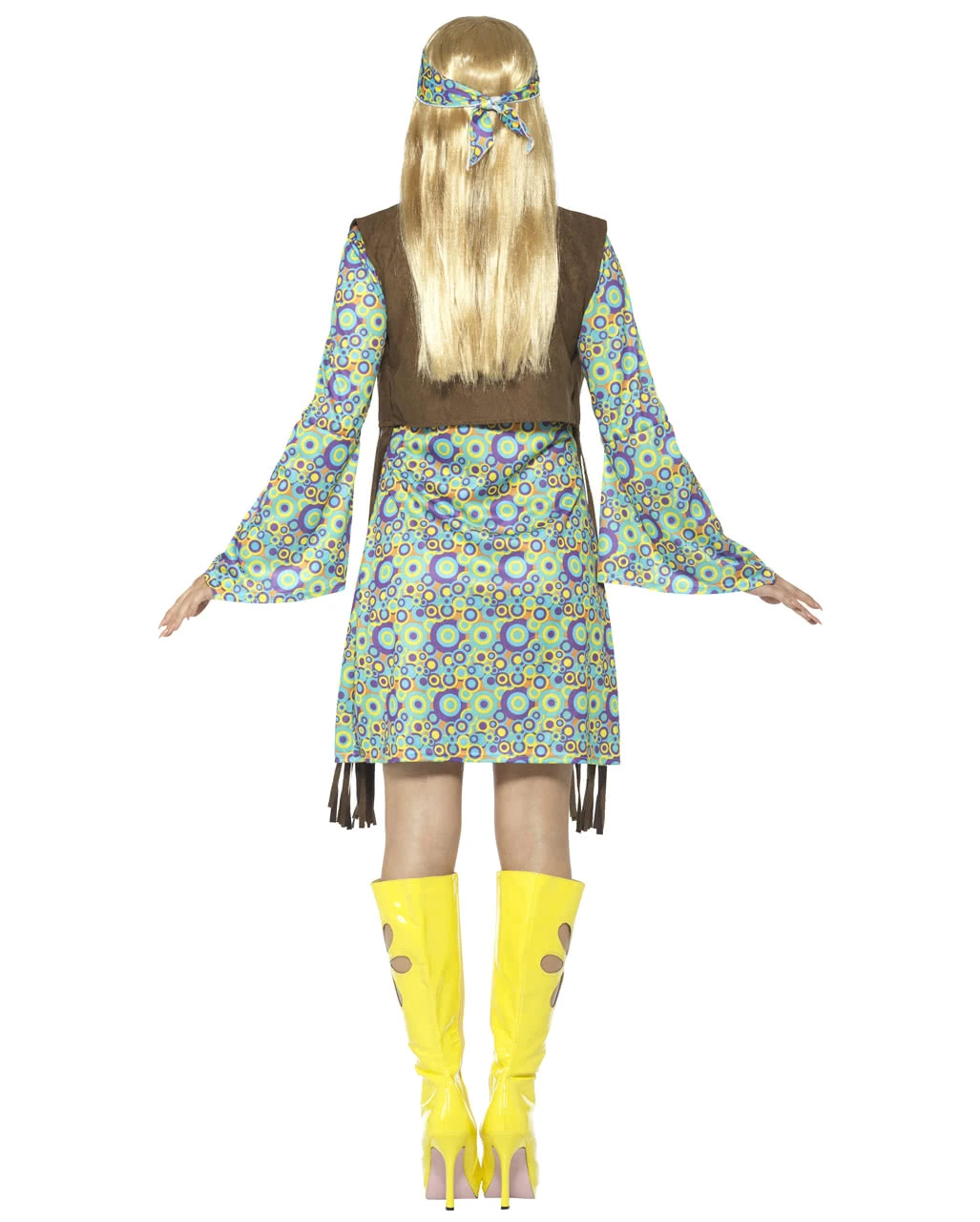 Das 60s Hippie Chick Kostüm besteht aus einem Kleid mit angenähter Weste, einer Halskette und einem Kopftuch. Das Kleid der Woodstock-Verkleidung verfügt über weite Trompetenärmel und ist übersät mit bunten Kreisen im Hippie-Stil. Eine angenähte Fransenweste mit Smiley- und Peace-Zeichen-Verzierungen unterstreicht den Flower-Power-Style. Ein lässiges Kopftuch im passenden Design sowie eine goldene Peace-Halskette komplettieren deinen Love-and-Peace-Look an Fasching! Dazu passen die Flower Power Brille mit Ohrringen und die Hippie Tasche Kostümzubehör.