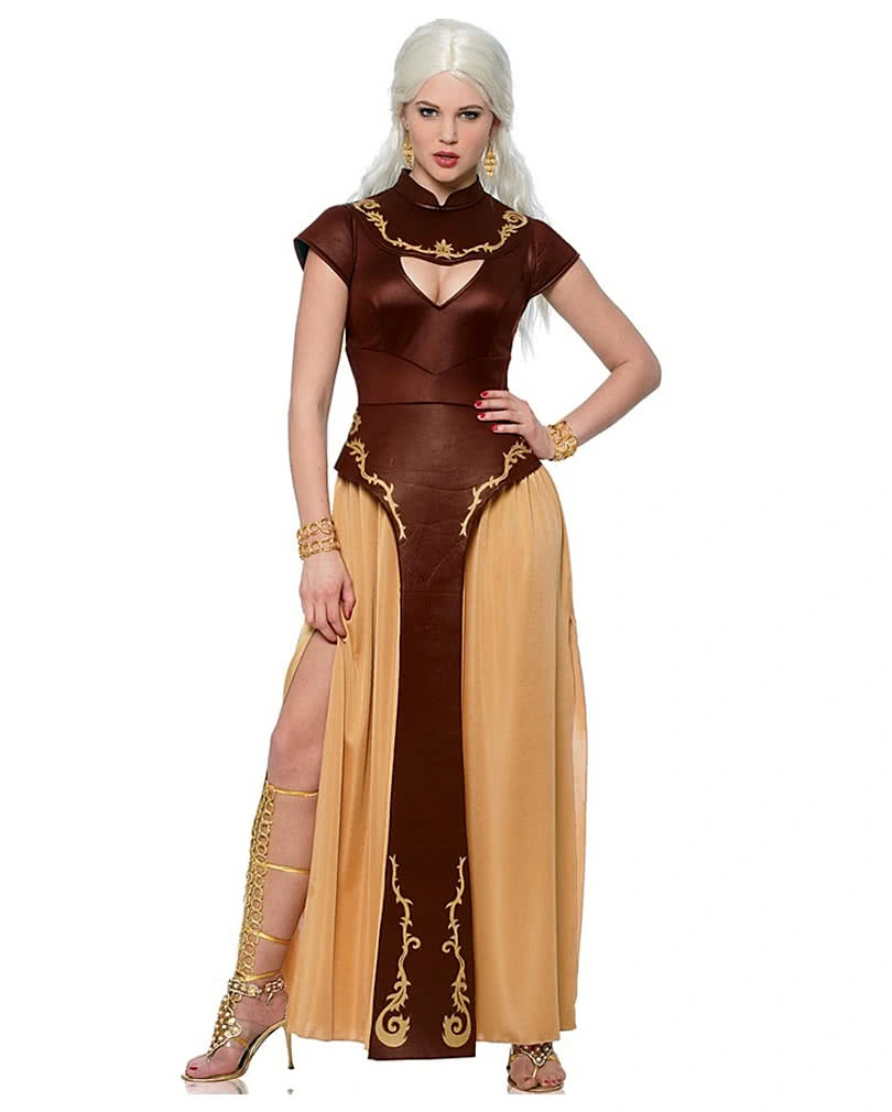 Unser neues Drachenkriegerin Kostüm ist ein bodenlanges Gewand für Frauen. Das dunkelbraune Oberteil des Kostüms hat kurze Ärmel, einen kleinen Stehkragen und es ähnelt einem engen Korsett. Zum Drachenkriegerin Kostüm gehört ein angenähter Unterrock in beiger Farbe. Die schönste Verzierung auf dem Drachenkriegerin Kostüm sind die goldenen Stickereien, die den Kragen, die Taille und den Rock dekorieren. Deiner Drachen Prinzessin Verkleidung fehlt noch die passende Game of Thrones – Targaryen Wappen Kette.