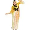 Das Seeräuberin Kostüm besteht aus einer Jacke in bordeauxrot, einem weiß/schwarz gestreiften Rock und einem Gürtel mit Glitter auf der Schnalle. An der Jacke sind goldene Knöpfe angebracht, der rote Stoff ist mit Blumen bedruckt. An den Ärmelenden ist ein Spitzenbesatz angenäht. Der Rock ist zweilagig, unter dem schwarz – weiß gestreiften Stoff befindet sich eine lage aus weißem Stoff mit schwarzem Spitzenbesatz.. Der Gürtel besteht aus schwarzem Stoff, die Schnalle ist aus Metall.