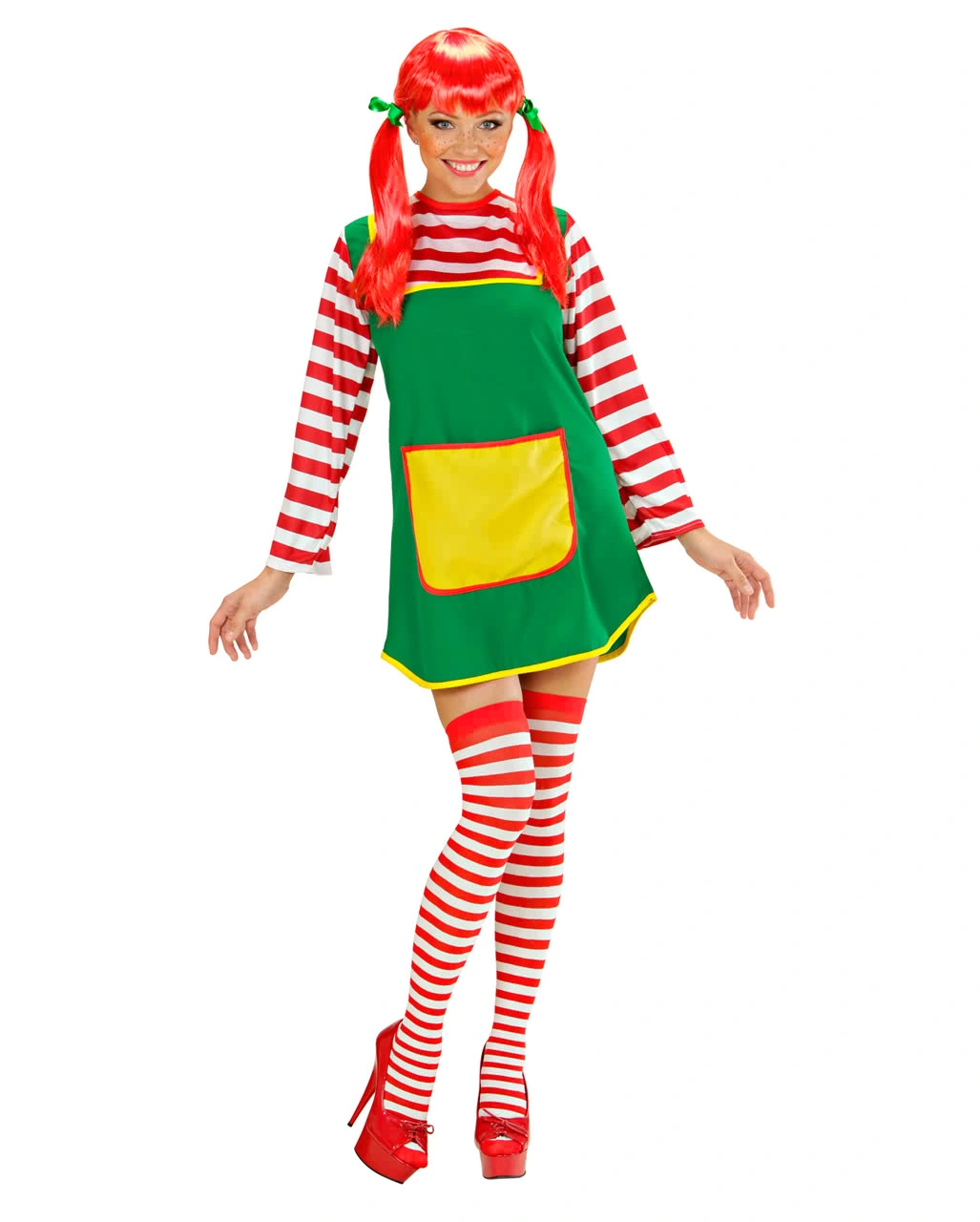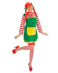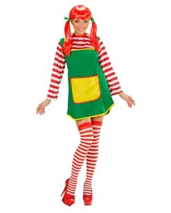 Das lustige freche Mädchen Damenkostüm besteht aus dem grünen Kleid mit angenähter Schürze und rot-weiß geringeltem Oberteil, das ebenfalls an dem Karnevalkostüm fest angenäht ist. Vervollständige dein Faschingskostüm doch mit der Freche Göre Kinderperücke mit Zöpfen und schminke dir lustige Sommersprossen und schon bist du der freche Wirbelwind, der mit List und Tricksereien, alles auf den Kopf stellt.