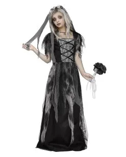 Das Friedhofs Braut Kinderkostüm mit Schleier als langes Hochzeitskleid mit ausgestelltem Rock ist bestens geeignet für Teenager Horror Fans. Das untere schwarze Kostümkleid ist geziert mit schwarz glänzendem Tüll, grauen Stoff Fetzen & schwarzer Spitze die übereinander lappen. Der obere Teil des Brautkleids ist mit einer Schnürung, schwarzer Spitze & kurzen Fetzen Ärmeln geziert. Der Horror Brautschleier in Form eines Haarreifens mit silbernen Rosen & grau-schwarzen Stofffetzen ist ein Blickfang. Wenn die Braut-Mutter sich mit dem Friedhofs Braut Halloweenkostüm mit Schleier verkleidet, dann kann die Horror Hochzeits Zeremonie an Halloween starten.