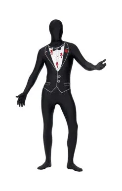 Der schwarze Gangster Skin Suit mit den blutigen Einschusslöchern lässt sich dank des Reißverschlusses von Hüfte bis Kopf öffnen und schließen, so dass du sogar dein Gesicht mit dem Mobster-Look versehen kannst. Falls du in diesem stylischen Kostüm mal auf die Toilette musst, kannst du den Schrittbereich ganz einfach mit dem Klettverschluss öffnen. Und damit du während deines einmaligen Auftritts nicht deine Wertsachen verliert, ist beim Kostüm auch ein zum Outfit passender Beutel zum Umbinden in der Lieferung dabei. Um deinen Look zu komplettieren, empfehlen wir den Gangster Hut schwarz und unser Aufblasbares Maschinengewehr.