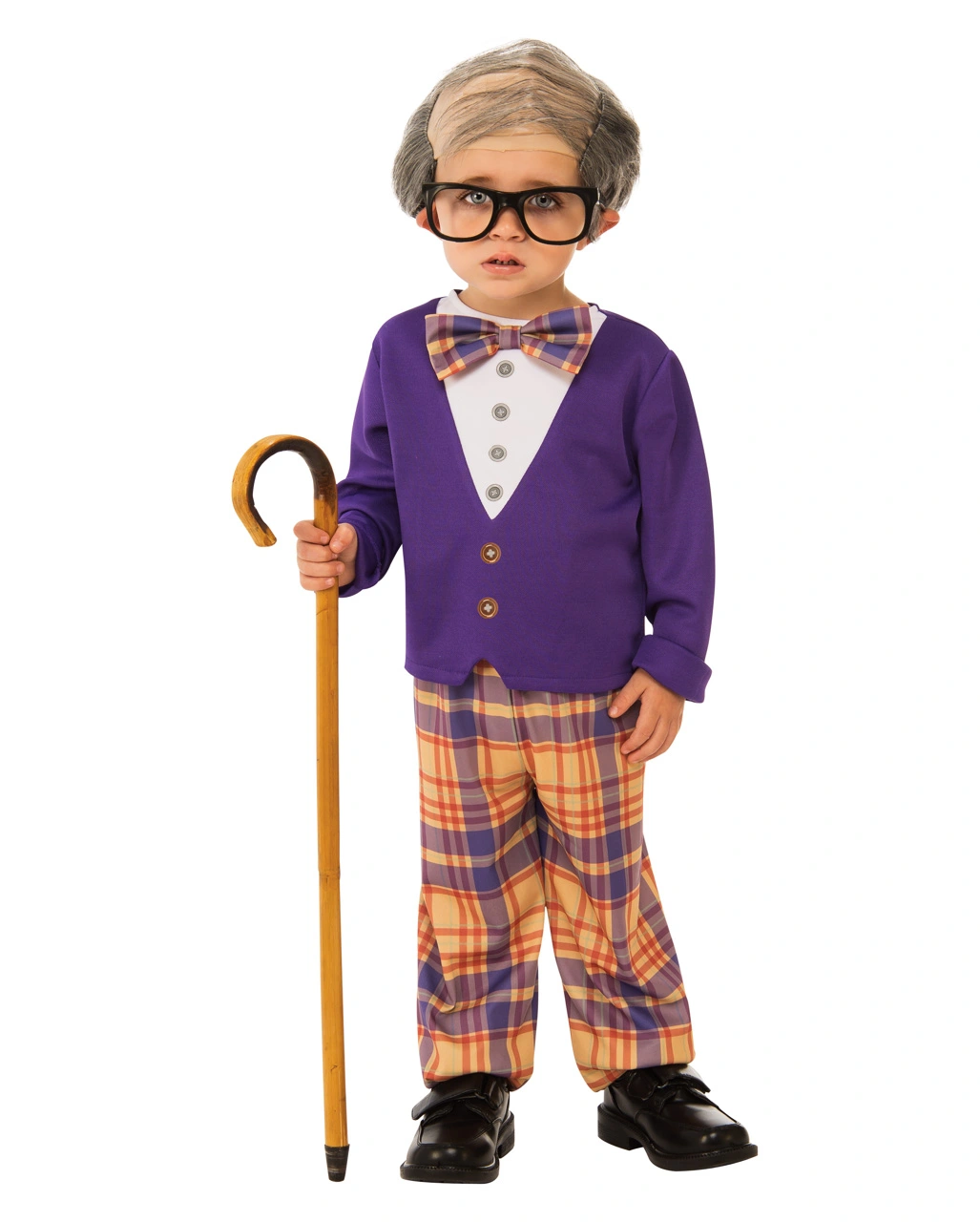 Unser Großvater Kinderkostüm zeigt das Outfit eines älteren Herrn mit Stil. Das Kostüm Set der Opa Verkleidung besteht aus einer hübsch karierten Hose in fröhlichem Orange und Lila. Schließlich bist Du ein Opa mit viel Lebenslust. Auch das lichter werdende Haar, das sich auf der genialen Perücke mit Halbglatze und grauen Haarteilen zeigt, mindert nicht Deinen Spaß am Fasching. Deshalb kommt auch der Sweater zum Überziehen in dunklem Lila und der passend karierten Krawatte daher. Das lustige Kostüm wird bei Kostümpartys oder beim Fasching für Begeisterung sorgen. Passend dazu empfehlen wir die Brille mit runden Gläsern.