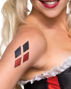 Tätowiere dich mit dem Harley Quinn Glitter Tattoo als Vollendung für deine Harlekin Verkleidung. Das rot-schwarze Rauten-Muster wird dein DC Comicfiguren Kostüm an der Comic Mottoparty perfektionieren & zeigt dass du ein echter Batman Fan bist.