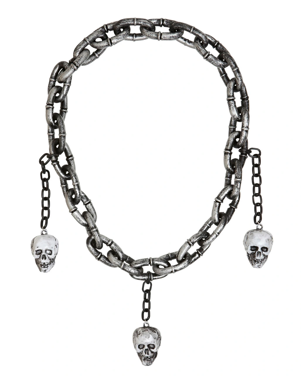 Als unheimlich anmutendes Kostümzubehör ist die Henker Halskette mit Totenköpfe ebenso ideal für viele Halloween Kostüme. Der Fantasy Kostüm Schmuck besteht aus groben Gliedern in Silber/Grau. Eindrucksvoll zeigen sich besonders die drei Totenköpfe an dem Fantasy Schmuck Accessoire, die daran befestigt sind. Passend dazu empfehlen wir den Totenkopf Ringe 12 Stück.