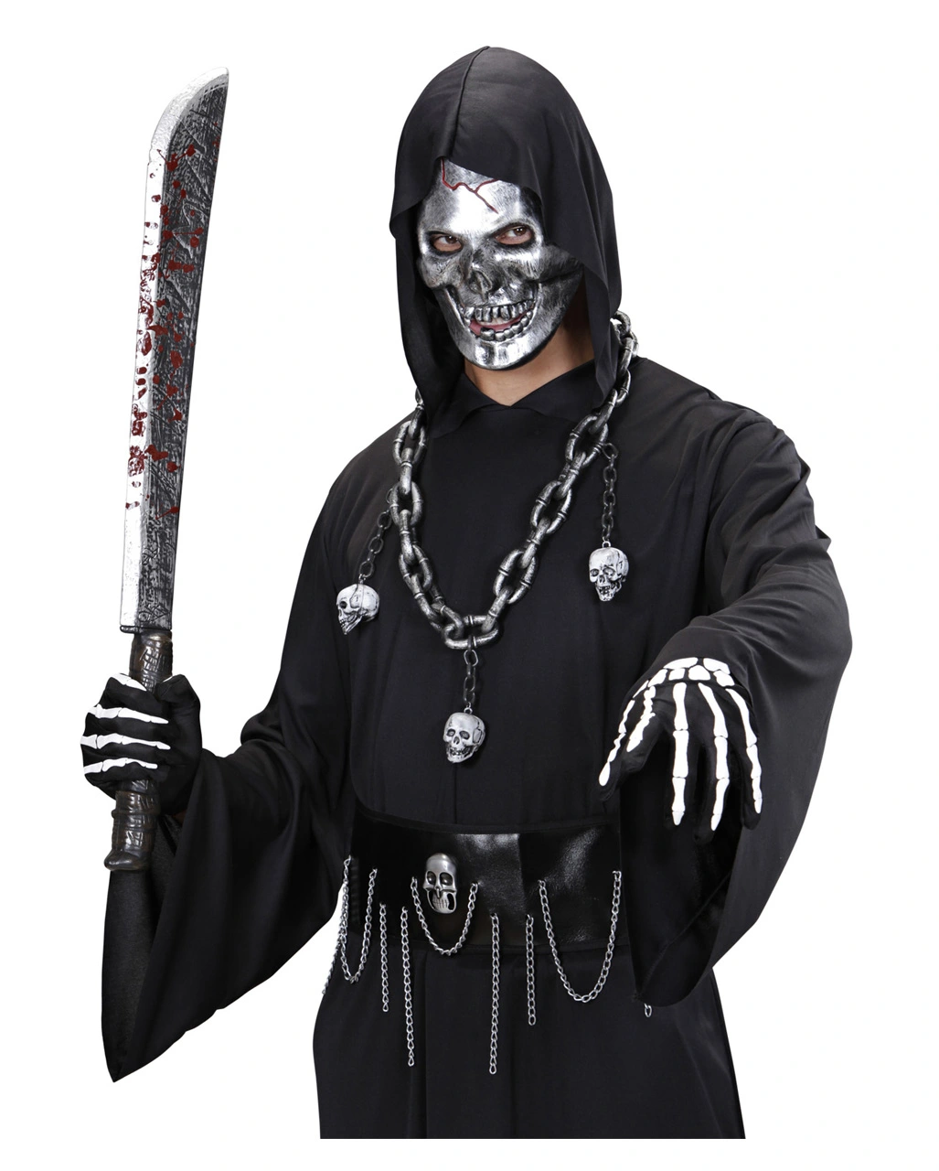 Die Henker Halskette mit Totenköpfe verleiht deinem Auftritt als Sensenmann das gewisse Etwas. Ein gruselige Glieder Kette mit Totenschädeln gehört schließlich zu jedem perfekten Styling eines Sensenmanns dazu. Damit zeigst du, dass du eisern in deinen Entscheidungen bist. Egal ob als Henker oder als unheimlicher Reaper beim Live Rollenspiel.