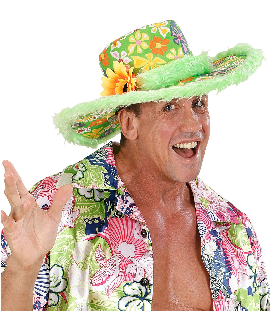 Der Ibiza Hut mit Plüsch Grün ist ein wahrer Muntermacher. Auch an trüben Tagen hebt er die Stimmung mit seinem fröhlichen Farbmix aus orangenen, gelben, blauen und weißen Blumen auf grünem Grund. Der Hut liegt leicht auf dem Kopf, die witzige Plüschumrandung und die große Blume machen den wahrhaft frohsinnigen Charme der Kopfbedeckung aus. Wie wäre es passend dazu mit einer lustigen Herz Sonnenbrille?