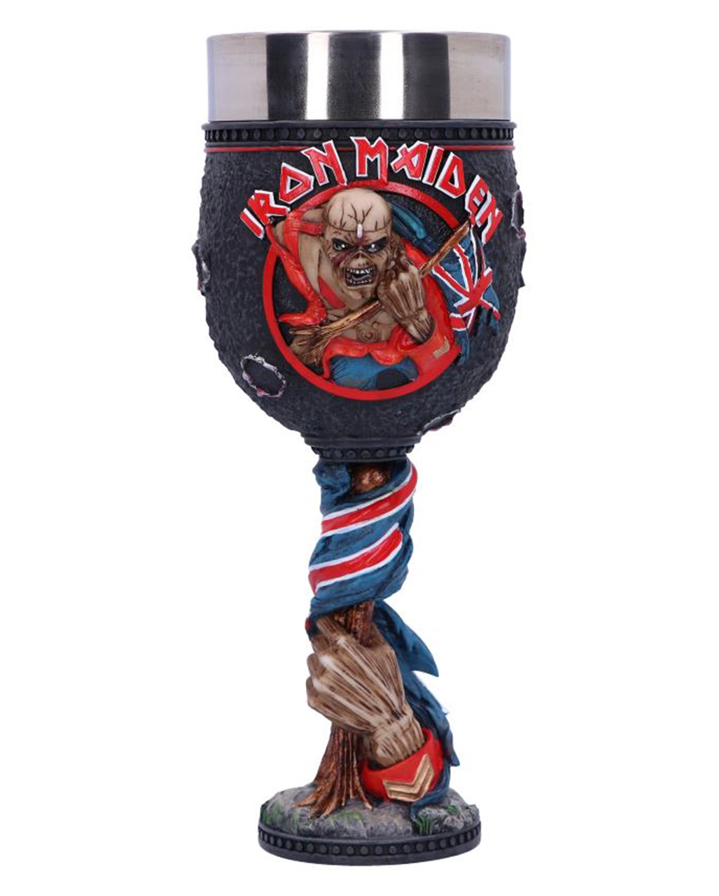 Dieser lizenzierte Iron Maiden „The Trooper“ Kelch zeigt keinen Geringeren als Eddie – das Maskottchen der Metal Band Iron Maiden. Dieser kommt mit britischer Flagge in der Hand und entschlossener Pose. Für Sammler & Metal Heads ist unser Eddie The Trooper Kelch ein Muss in jeder Fan-Sammlung!