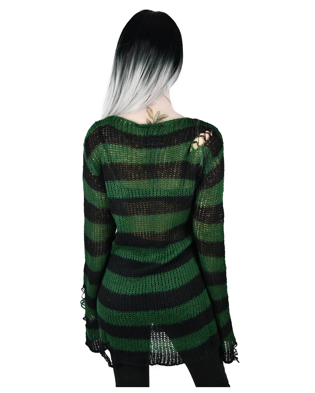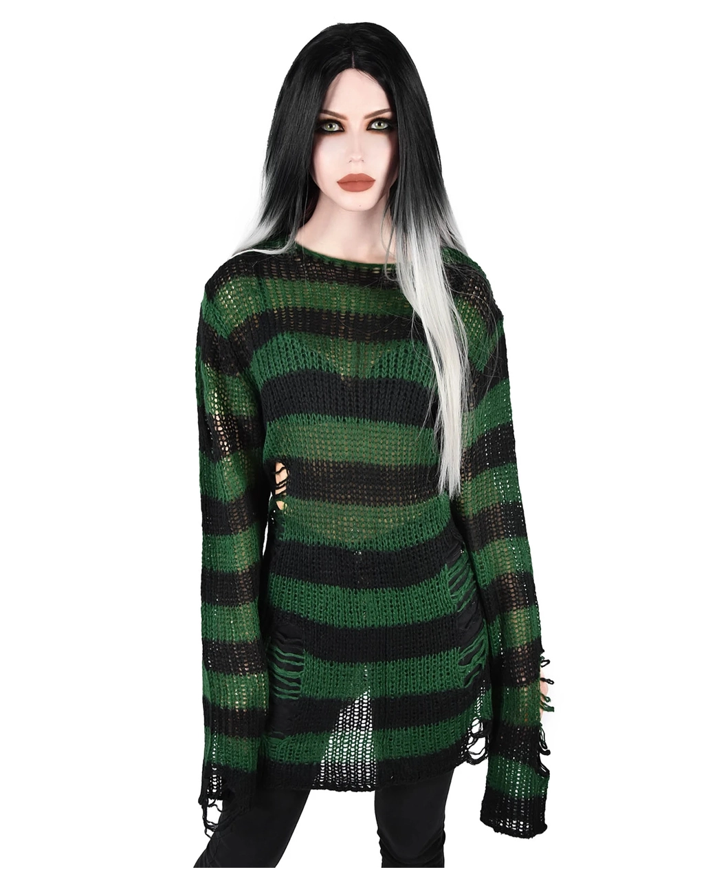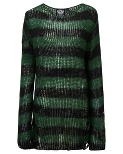 Unser KILLSTAR Absinthe Strickpullover ist das ideale Gothic Oberteil fĂŒr alle, die ihren alternativen Mode Look mit einem besonders lĂ€ssigen KleidungsstĂŒck kultivieren wollen. Der Unisex Strickpulli in grĂŒn-schwarz gestreiftem Design ist ein echtes Statement. Du bist cool drauf und feierst deinen Lebensstil mit einer relaxten Attitude. Dein Style ist nicht bloĂ Mode, sondern eine Unterstreichung deines besonderen und ganz eigenen Charakters. Sei, wer du bist und zieh dich auch so an!