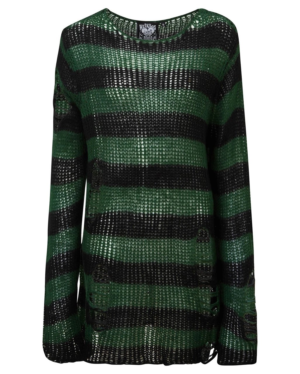Der weiche KILLSTAR Absinthe Strickpullover erinnert an den Grunge der 90er Jahre und eignet sich perfekt zum Ăberziehen – oder zum Tragen als EinzelstĂŒck. Der Gothic Pulli ist schwarz und gedĂ€mpft grĂŒn gestreift, mit extra langer LĂ€nge fĂŒr einen relaxten Look. Mit Distress-Details und tiefem Ausschnitt ist er ideal fĂŒr Festivals, MitternachtsspaziergĂ€nge mit dem Mond und verkatertes SonntagsvergnĂŒgen. Kombiniere den KILLSTAR Absinthe Strickpullover mit schwarzen Leggings und einem eleganten Halsband fĂŒr einen besonderes lĂ€ssigen Look.