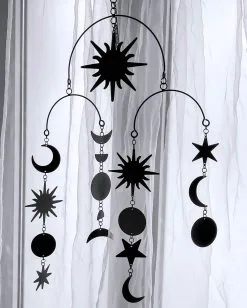 Mit dem KILLSTAR Cosmical Mobile zeigst du, wie sehr du an die mystische Welt glaubst. Die Symbole von Sonne, Monden und Sternen, die in einer besonderen Anordnung eine wunderbare Gothic Deko bilden, wurden aus Metall gefertigt. Sie sind schwarz lackiert und ergeben als HĂ€ngedeko einen magischen Blickfang an deiner Zimmerdecke.