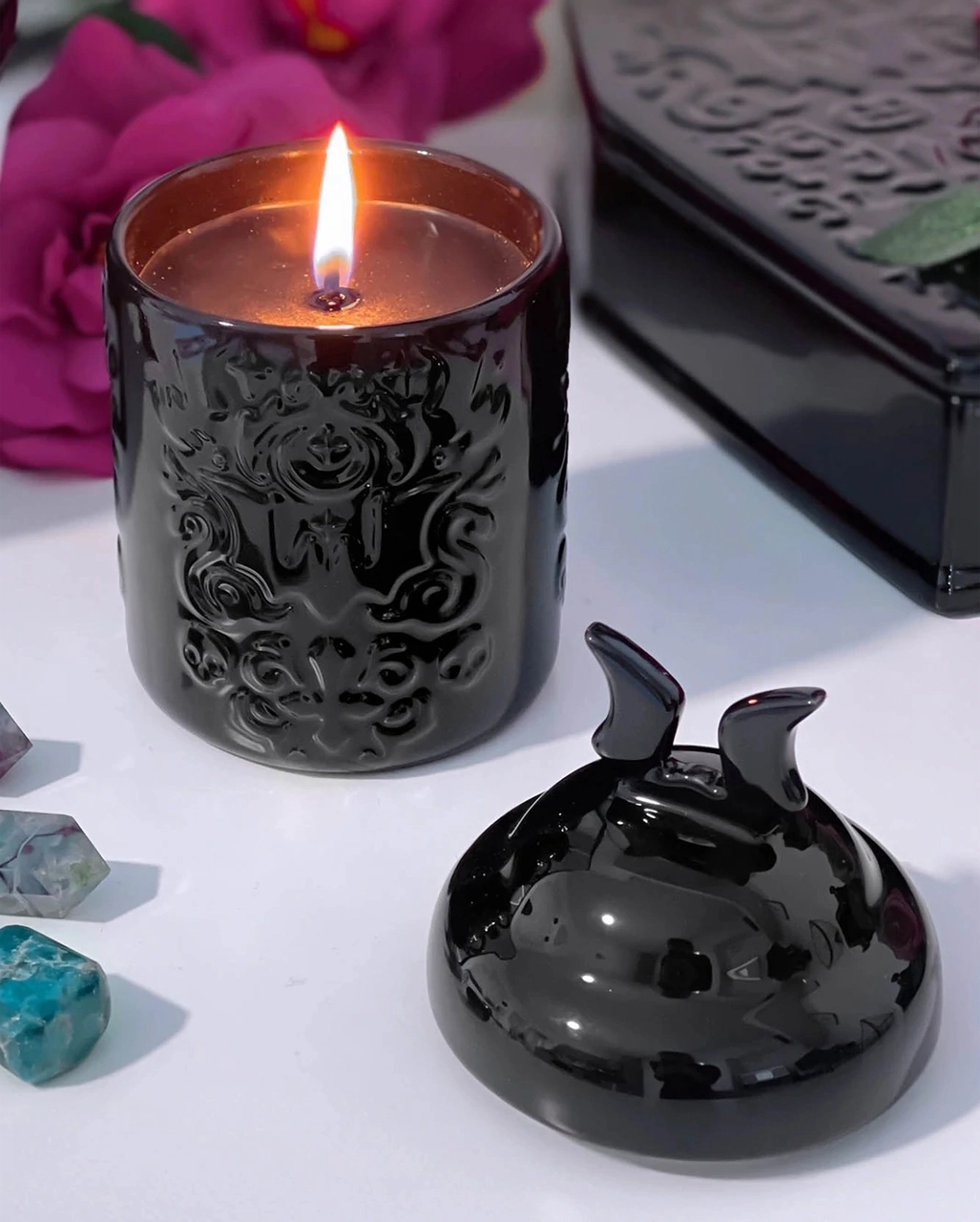 Mystische Duftkerze im dämonischen Gothic-Look mit Keramik-Deckel