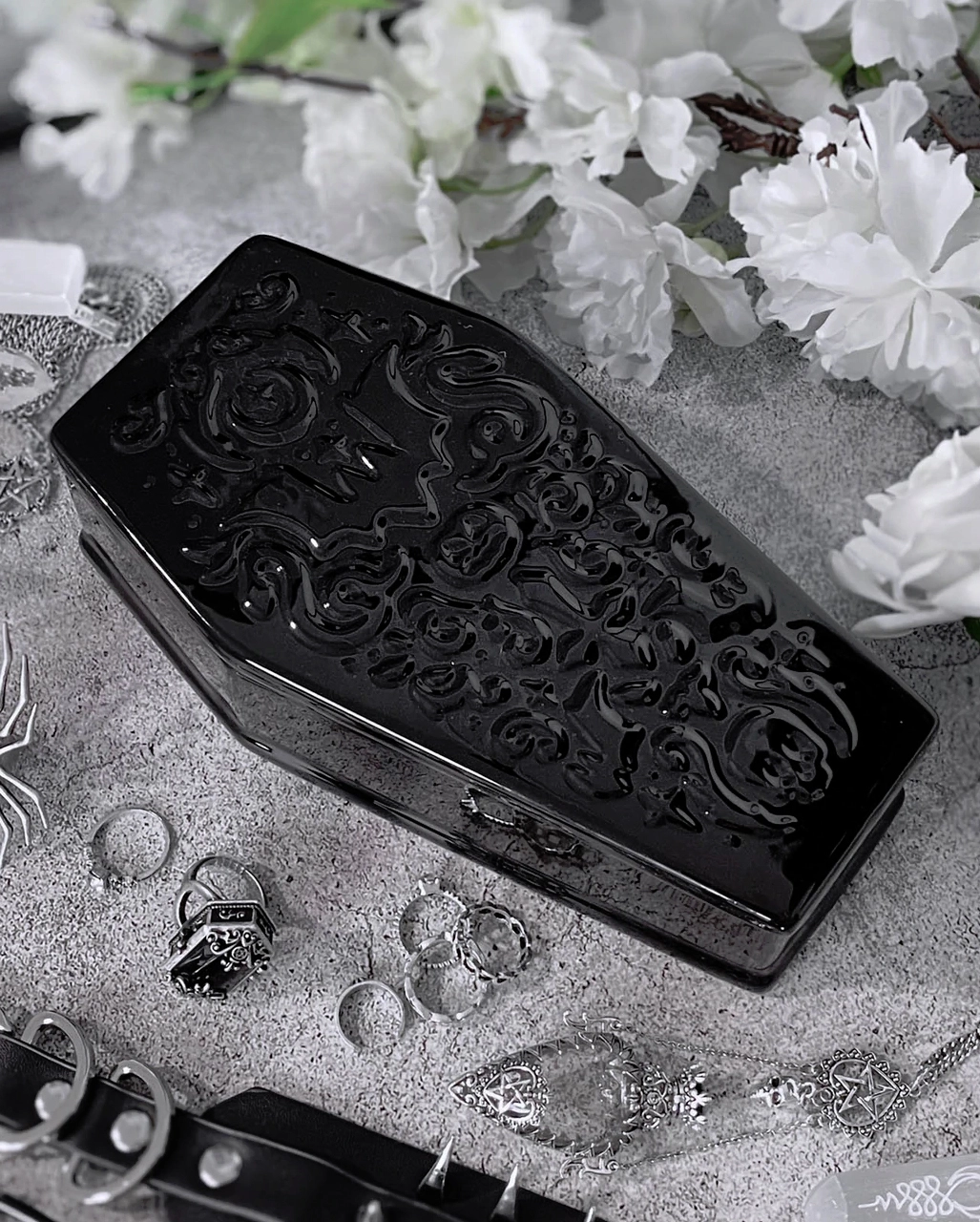 Verleihe deiner Gruft schwarze Eleganz, und dekoriere mit KILLSTAR Wohnaccessoires. Unsere KILLSTAR Daemon Sarg Schmuck Schatulle besticht mit einer eindrucksvollen Oberflächenstruktur. Nutze den kleinen Keramik Sarg als Aufbewahrung für Gothic Schmuck, Schlüssel, Geld oder kleine Geheimnisse. Die dekorative Sarg Box mit Deckel hütet alles, was dir lieb ist.
