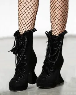 Die KILLSTAR Deadly Twin Stiefeletten sind natĂŒrlich schwarz. Auffallen wirst du mit diesen Gothic Damen Schuhen aber durch die Ketten Applikationen, die vom Saum ĂŒber die Hacken fallen, und durch die schwarzen RĂŒschen. Der Absatz der Plateau Stiefeletten fĂ€llt durch seine geschwungene Form auf. Um deinen Look zu vervollstĂ€ndigen holst du dir noch die Netzstrumpfhose mit floraler Spitze  und das KILLSTAR Hellrazor Fishnet Top dazu.