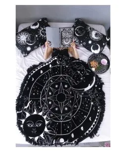 Willst du deiner Krypta ernsthafte kosmische Schwingungen hinzufügen? Brauchst du eine coole Meditationsdecke – oder einfach nur einen Wohnaccessoire für deine Rituale? Die runde KILLSTAR Sky Spirit Tagesdecke ist aus einem üppigen, weichen Stoff – mit einer riesigen Kontrastgrafik der Tierkreiszeichen, der Mondphasen und einem Sonne & Mond Motiv.