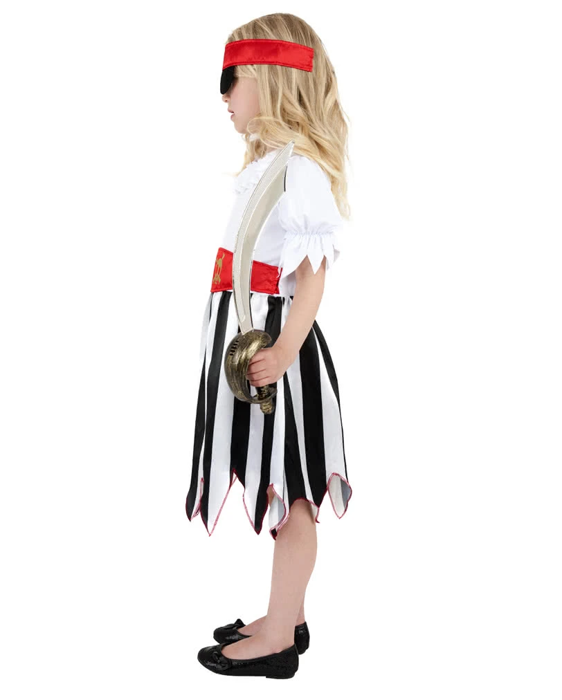 Das Kleine Piratin Kinderkostüm besteht aus einem roten Stirnband mit schwarzer Augenklappe, das hinten mit Klettverschluss verschlossen wird, und einem Kleid, dessen Saumenden spitz zugeschnitten sind und so dem Kostüm einen verwegenen Look geben. Das Oberteil des Kleides ist weiß, hat einen Rüschenkragen und an den Ärmeln versteckte Gummizüge. Der Rock ist schwarz-weiß gestreift. Das Kleid wird durch den festgenähten roten Gürtel mit aufgedruckten Totenkopf zum absoluten Hingucker. Um das Kostüm abzurunden empfehlen wir den Kleiner Piratensäbel silber.