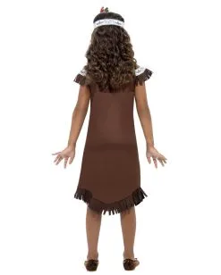 Das preiswerte Indianerin Mädchenkostüm besteht aus einem braunen Kleid mit Fransen, das auf der Vorder- und Seitenseite reichlich verziert ist, während die Rückseite ohne spezielle Applikationen und Stickerei auskommt. Das im Lieferumfang enthaltene Stirnband mit Federn passt farblich abgestimmt zur dekorativen Bordüre des Kostüms.