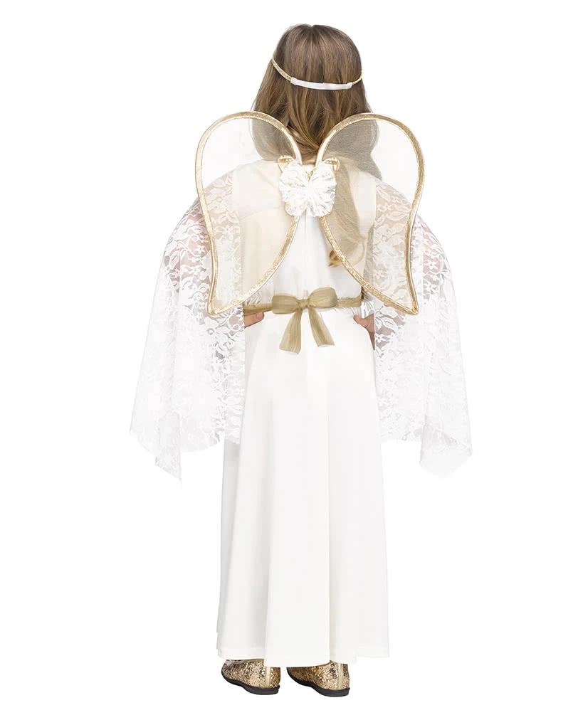 Das kleiner Engel Kleinkinderkostüm besteht aus Kleid, Schärpe, Haarband und Flügeln. Das weiße Kleid fällt bis zum Boden und weist an den Trompetenärmeln wie auch am Dekolleté florale Musterungen in Spitze auf. Um die Taille wird eine goldene Schärpe gebunden und ebenfalls goldene Engelsflügel können ganz einfach mit elastischen Zugbändern umgeschnallt werden. Das Haarband des Weihnachtskostüms, im Stil eines geflochtenen Kranzes gehalten, rundet das Bild einer himmlischen Gesandten stimmungsvoll ab. Weitere Weihnachtskostüme für Kleinkinder wie das Leoparden Jumpsuit Kostüm und das Weihnachtsbaum Kinderkostüm findest du ebenfalls bei uns im Horror-Shop.com.