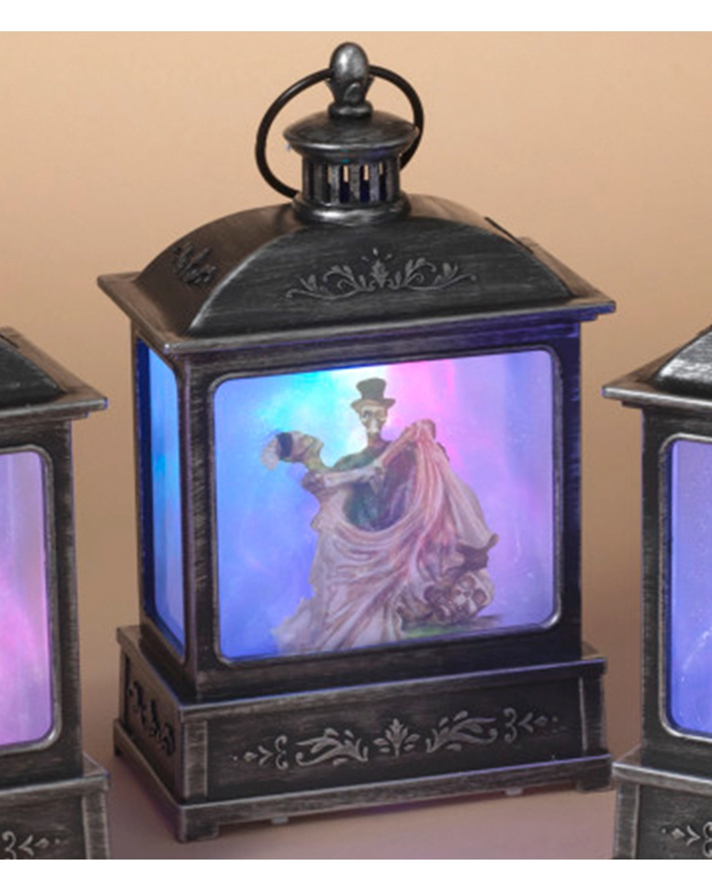 Rauchige Laterne im antiken Stil mit tanzendem Skelett Paar als Halloween Deko