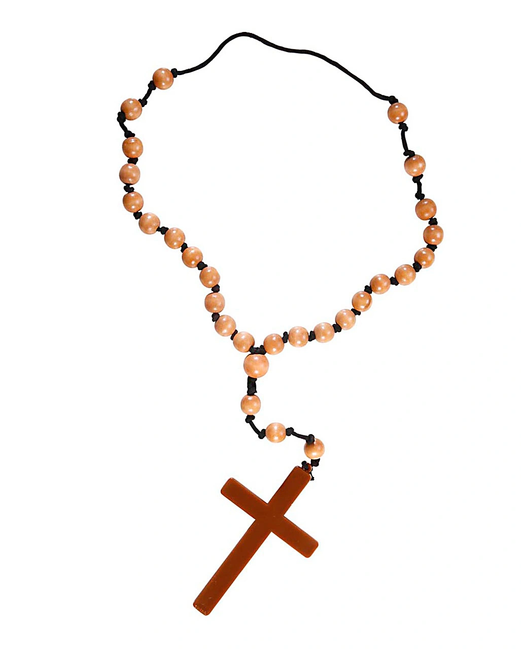 Der Rosenkranz mit Kreuz besteht aus einer schwarzen Kordel an die braune Holzkugeln aufgefädelt sind und in der Mitte ein braunes Kunststoffkreuz als Anhänger zeigt. Mit der realistsich aussehenden Ordenskette wirst du zum glaubhaften Klosterbruder.