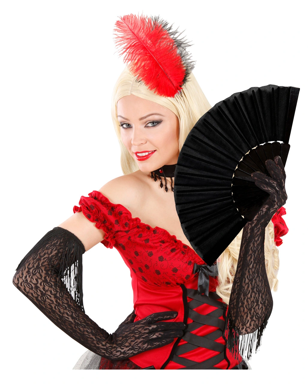 Der Schwarzer Fächer aus Stoff ist ein romantisches Kostüm Accessoire, das zum erotisch anmutenden Highlight wird, wenn Du es spielerisch einsetzt. Das edle Zubehör komplettiert Deinen Auftritt als geheimnisvolle Burlesue Tänzerin ebenso wie das Outfit der rassigen Flamenco Tänzerin. Auch als Can Can Luder wirst Du für viel Getuschel auf der Faschings Party sorgen. Vielleicht ziehst Du den edlen Fächer auch als schwarze Witwe vor Dein grinsendes Gesicht. Oder du fächerst Dir als heißes Saloon Girl ein wenig Luft zu.