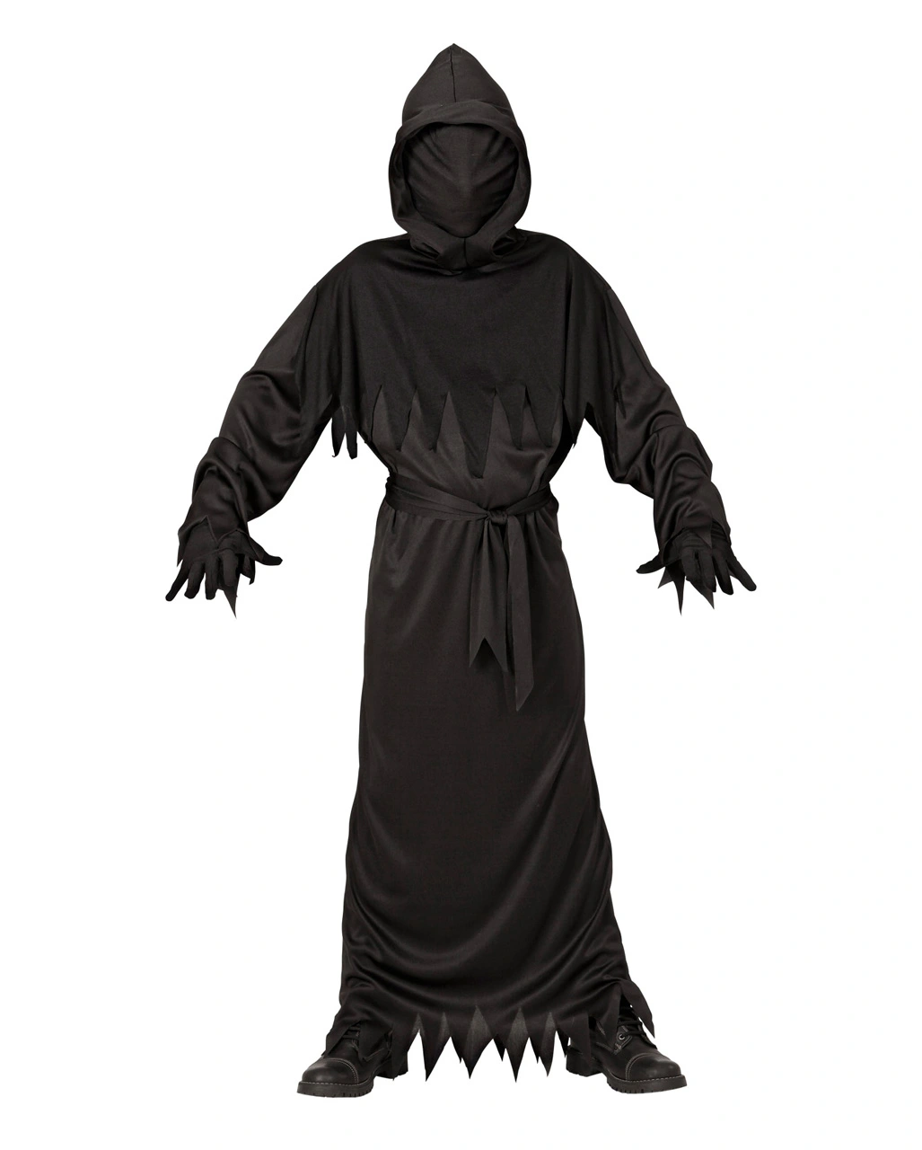 Wer wohl unter der dunklen Reaper-Kutte steckt und die Partygäste in den Tod begleitet? Vielleicht ist es ja dein Sprössling, der sich zu Halloween einen Spaß erlaubt und unser schwarzes Reaper Phantom Kinderkostüm trägt. Das unheimliche Kinder Sensenmann Kostüm besteht aus einer dunklen Robe, die an den Ärmeln und am Rocksaum fransig geschnitten ist. Ein Gürtel ist ebenfalls mit dabei und verleiht deiner Verkleidung perfekten Halt. Die finstere Kapuze verbirgt dein Gesicht hinter einem schwarzen Netz, aus dem du sehr gut heraussehen kannst, ohne dass dich dabei jemand erkennen kann.