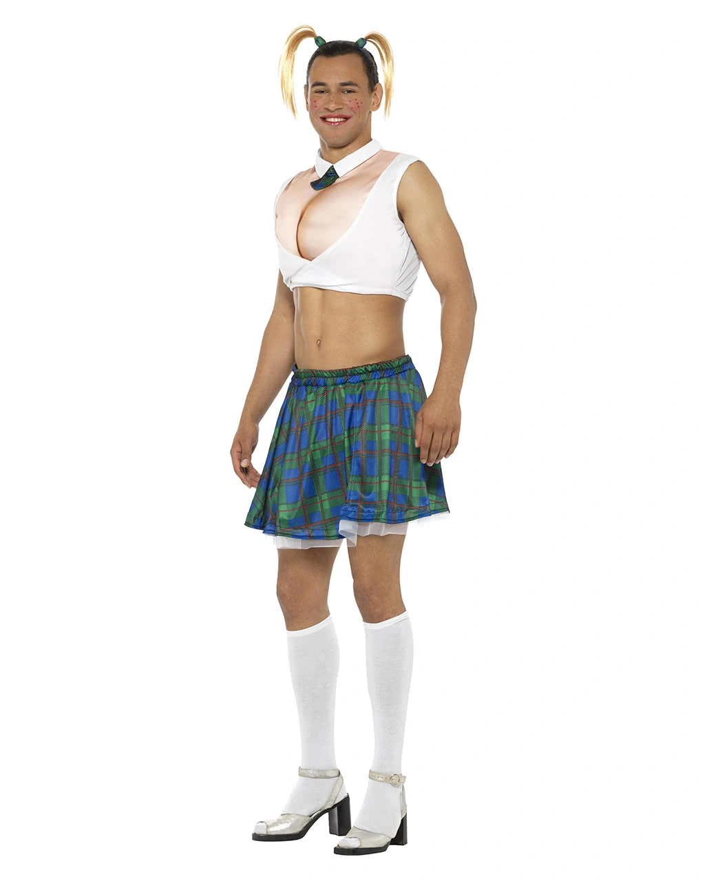 Mit dem sexy Schulmädchen Herrenkostüm werden sich deine Kumpels bei der Bachelor Party vor lachen in die Hose machen! Die Verkleidung für Männer verkleidet jeden Junggesellen in eine High School Schülerin mit kurzem Röckchen & riesigen Brüsten!