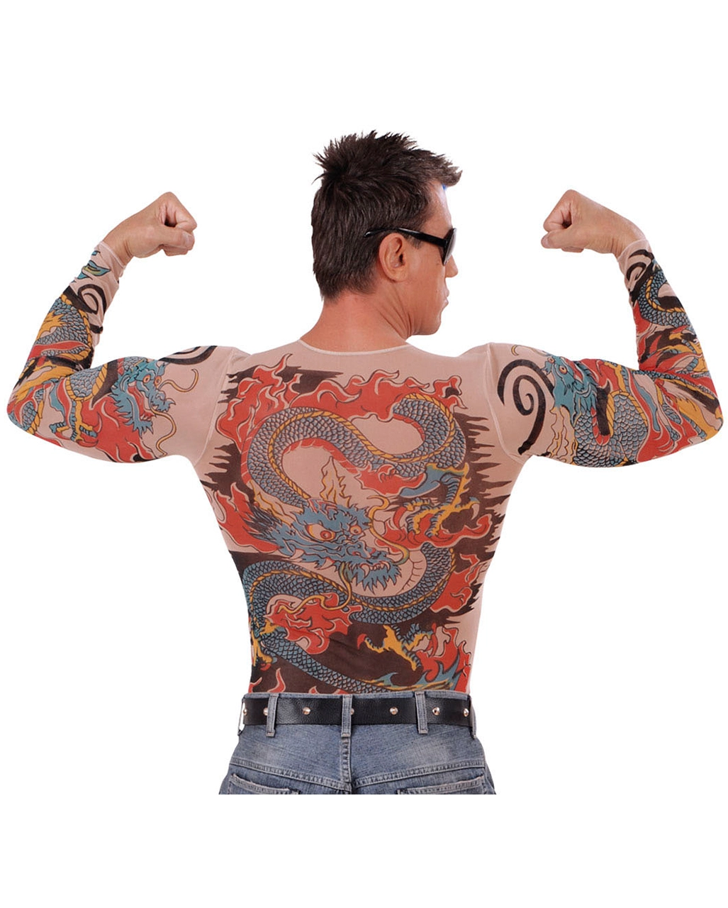 Tattoos sind Mega In und schon lange nicht mehr nur Matrosen & Gangstern vorbehalten. Die schmerzhafte Prozedur des tätowierens bleibt aber immer noch die Selbe. Mit unserem Tattoo Shirt Tiger & Drache hast du jetzt die Möglichkeit ein tätowierten Oberkörper zu zeigen, ohne das du davor unter die Nadel musst. Das Fake Tattoo Shirt ermöglicht dir jetzt ein komplett tätowierten Oberkörper, inklusive tätowierten Armen zu zeigen. Das wilde Aussehen des Tiger & Drachen Tattoos ist das perfekte Kostümzubehör für dein Auftritt als Gangster, Rocker oder Tiger King.