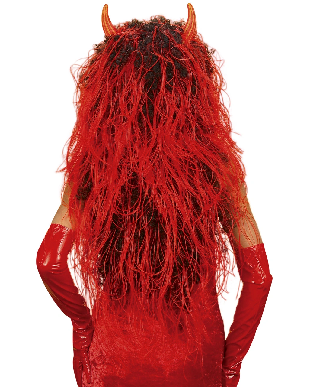 Feurig und heiß geht es in der Hölle zu und so manches Teufelsweib heizt dem Satan dabei richtig ein! Rot, glühendes und schwarz wie Kohle meliertes Haar mischt sich in der wilden Frisur, während rote Teufelshörner aus dem Wuschelkopf hervor stechen.