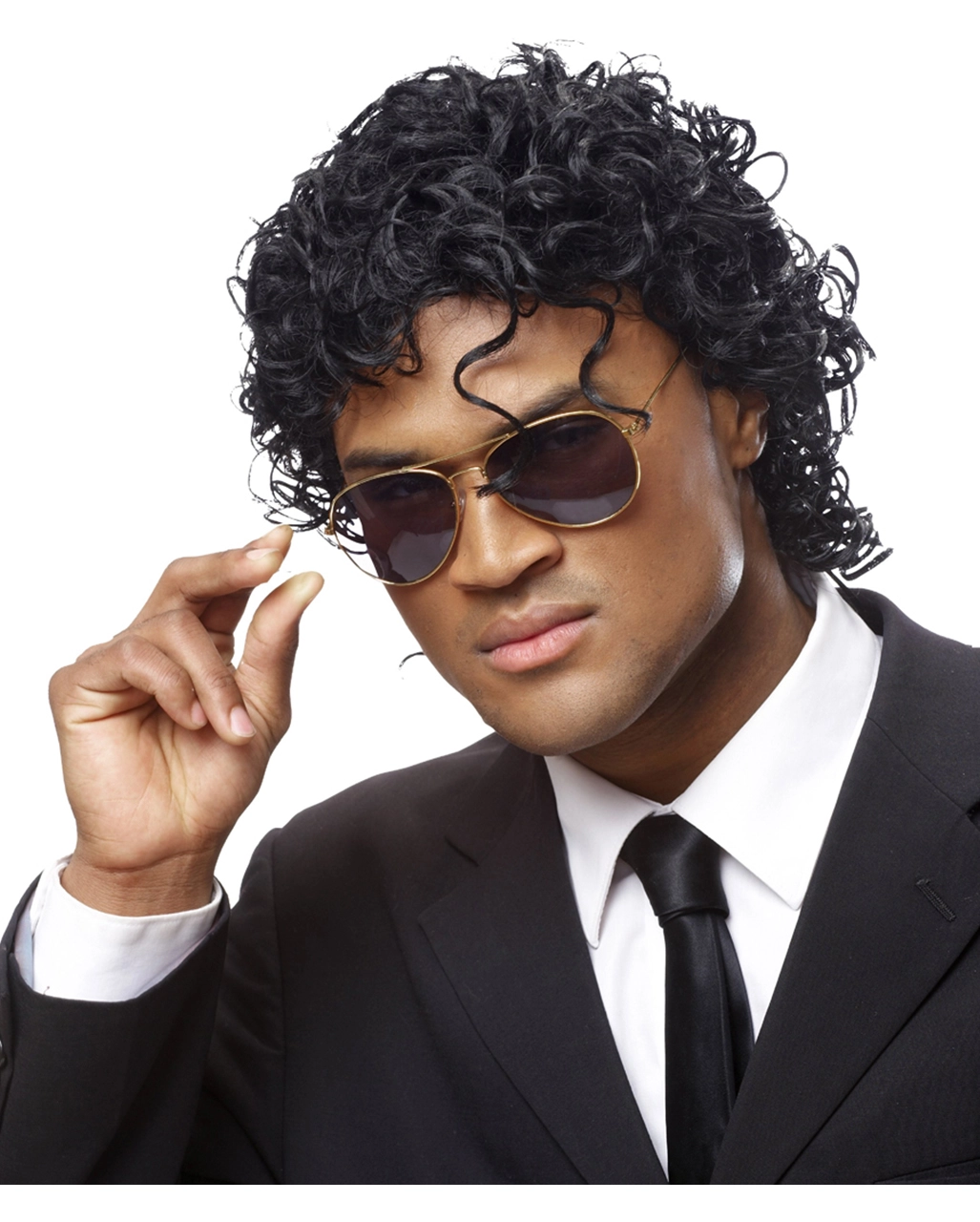 Schwarze Sonnenbrille, schwarzer Gangster Hut und eine schwarze Lockenfrisur im Wet Look, so kennen wir den King of Pop Look aus den 80er Jahren. Mit der Wet Look Perücke kannst du dich mühelos in den Popstar verwandeln und einen groovy Auftritt auf deinen Verkleidungs Events geniessen.